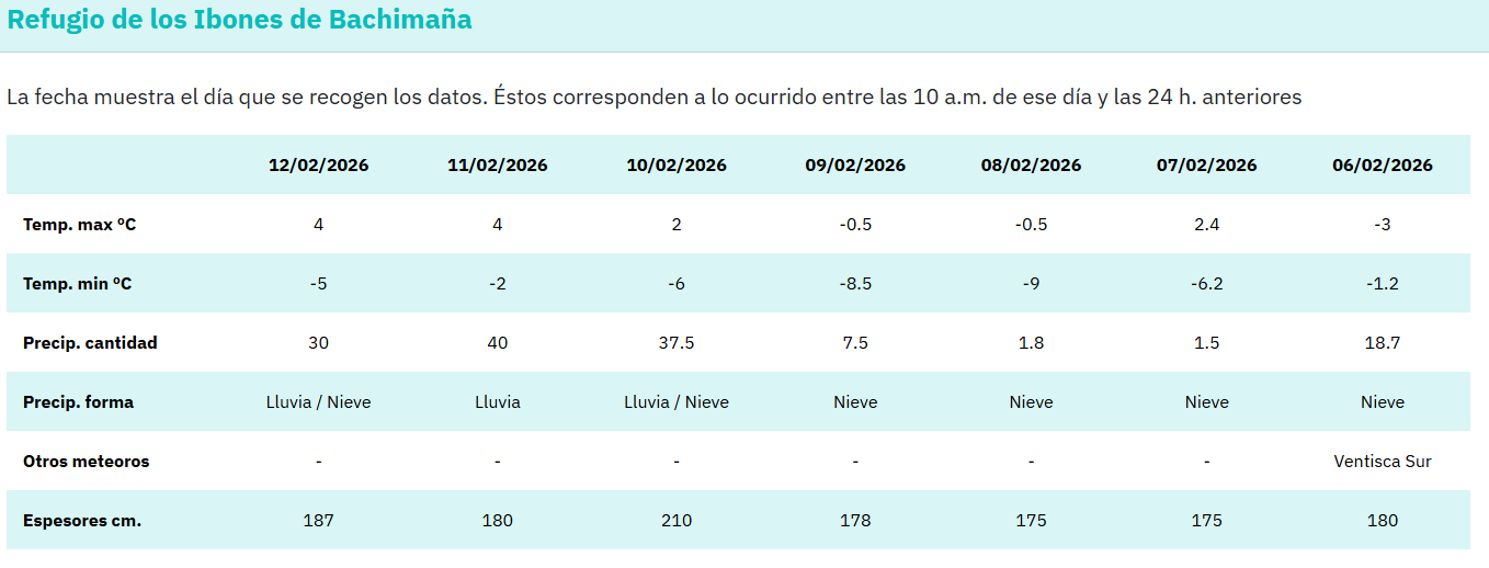 Aunque en cotas bajas y medias han menguado entre 20-30 cm, los espesores de nieve están por encima de la media siendo una temporada excepcional para la práctica del esquí de travesía. Actualmente se pueden iniciar las actividades de esquí de travesía o raquetas desde los 1.300 m, hemos medido 80 cm a 1.600 m, mientras que en cotas medias a 2200 m el telenivometro de Bachimaña registra 240 cm. En cotas altas por encima de los 2500 m se superan los 350 cm. No se aprecian diferencias a penas entre las orientaciones N y S.